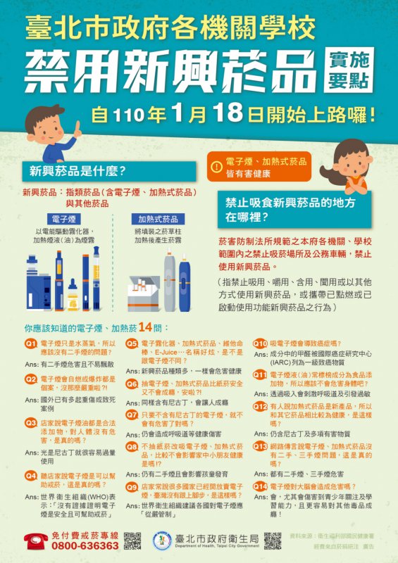 「臺北市政府各機關學校禁用新興菸品(電子菸)實施要點」自110年1月18日起生效。