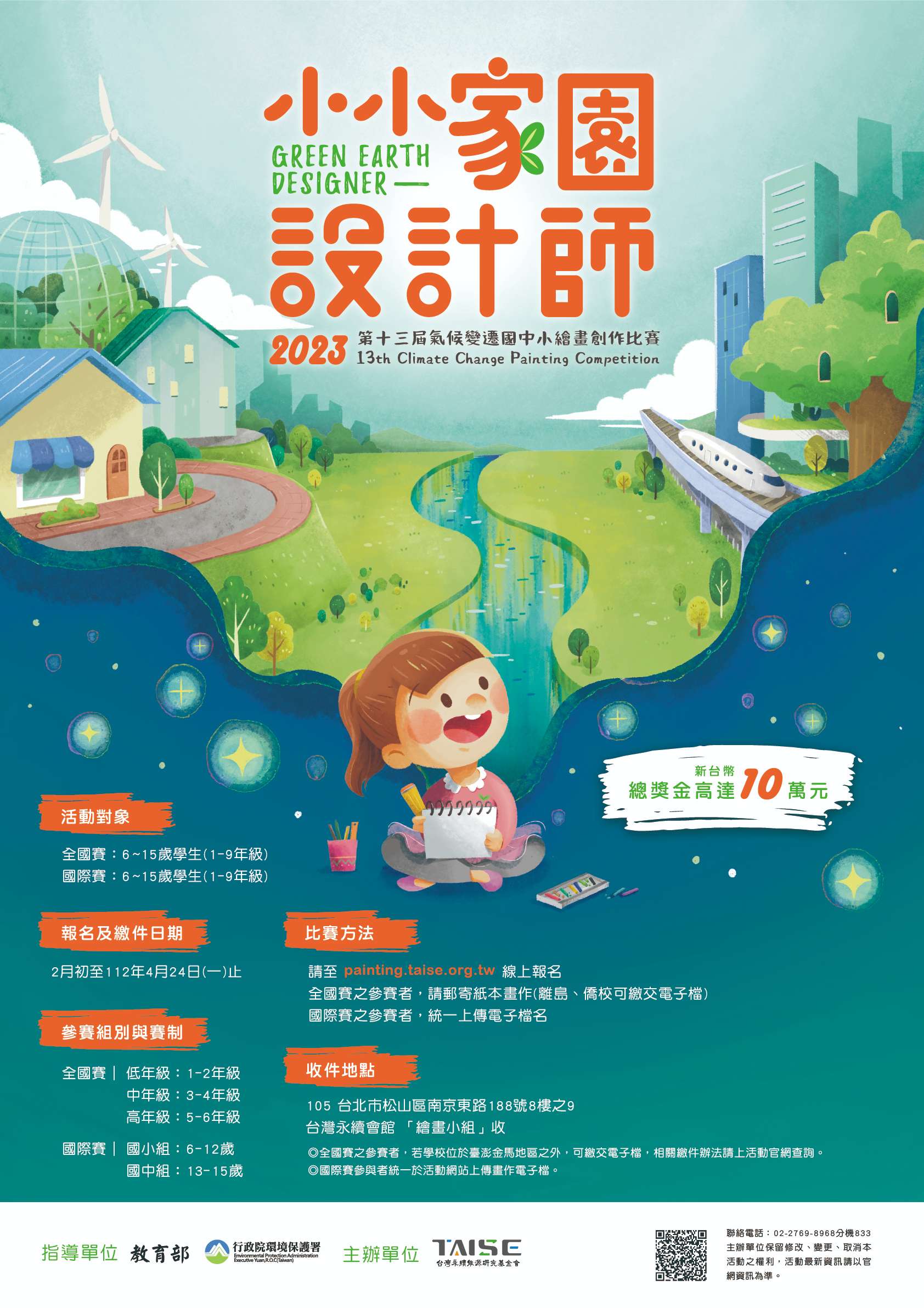 一、由教育部、行政院環境保護署指導,本會主辦之「氣候變 遷國中小繪畫創作比賽」迄今已舉辦12屆,累計40國、 59,152名學子參與。本屆(第13屆)為呼應聯合國永續發展 目標(SDGs)的第11項,以「小小家園設計師」為主題,提 升國中小師生關注天然災害對城市造成的損傷,思考如何 降低城市垃圾和空氣污染,同時重視社區文化與自然遺產 等。此繪畫比賽也呼應第13項,採取氣候行動並提升大眾 相關意識。