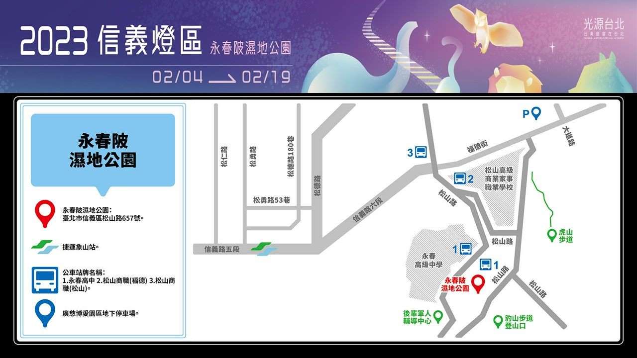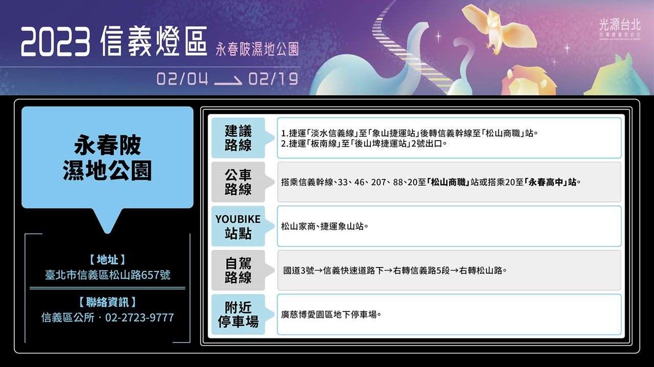 詳情請上臺北市信義區公所網站2023信義燈區(https://xydo.gov.taipei /News.aspx? n=1D7B24F82BFCC2C1&sms=2E4AC22F026B487B)