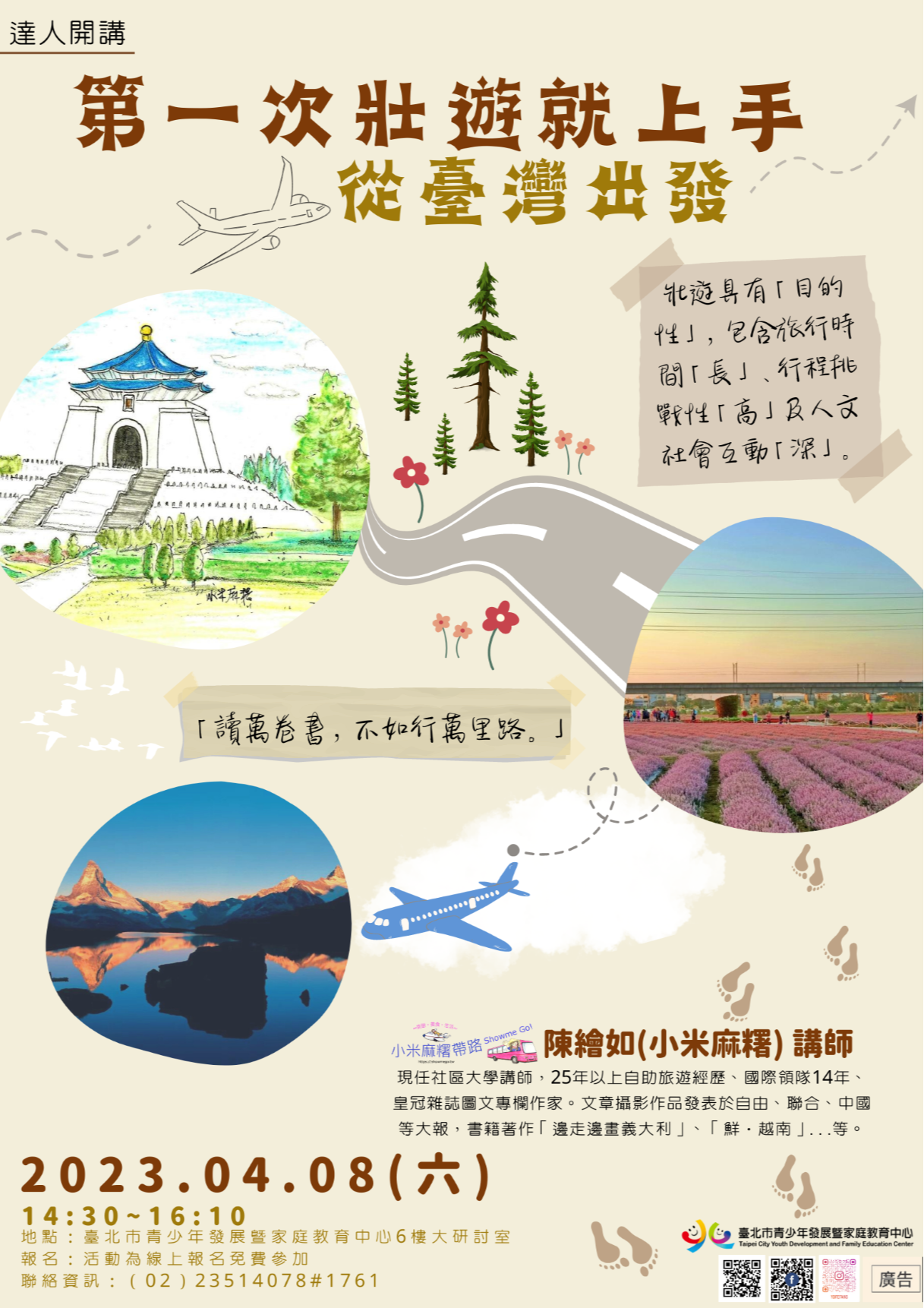 (六)此場為壯遊達人講座,凡申請112年臺北市青少年壯遊臺 灣補助計畫團隊參與講座附照片者得加分。