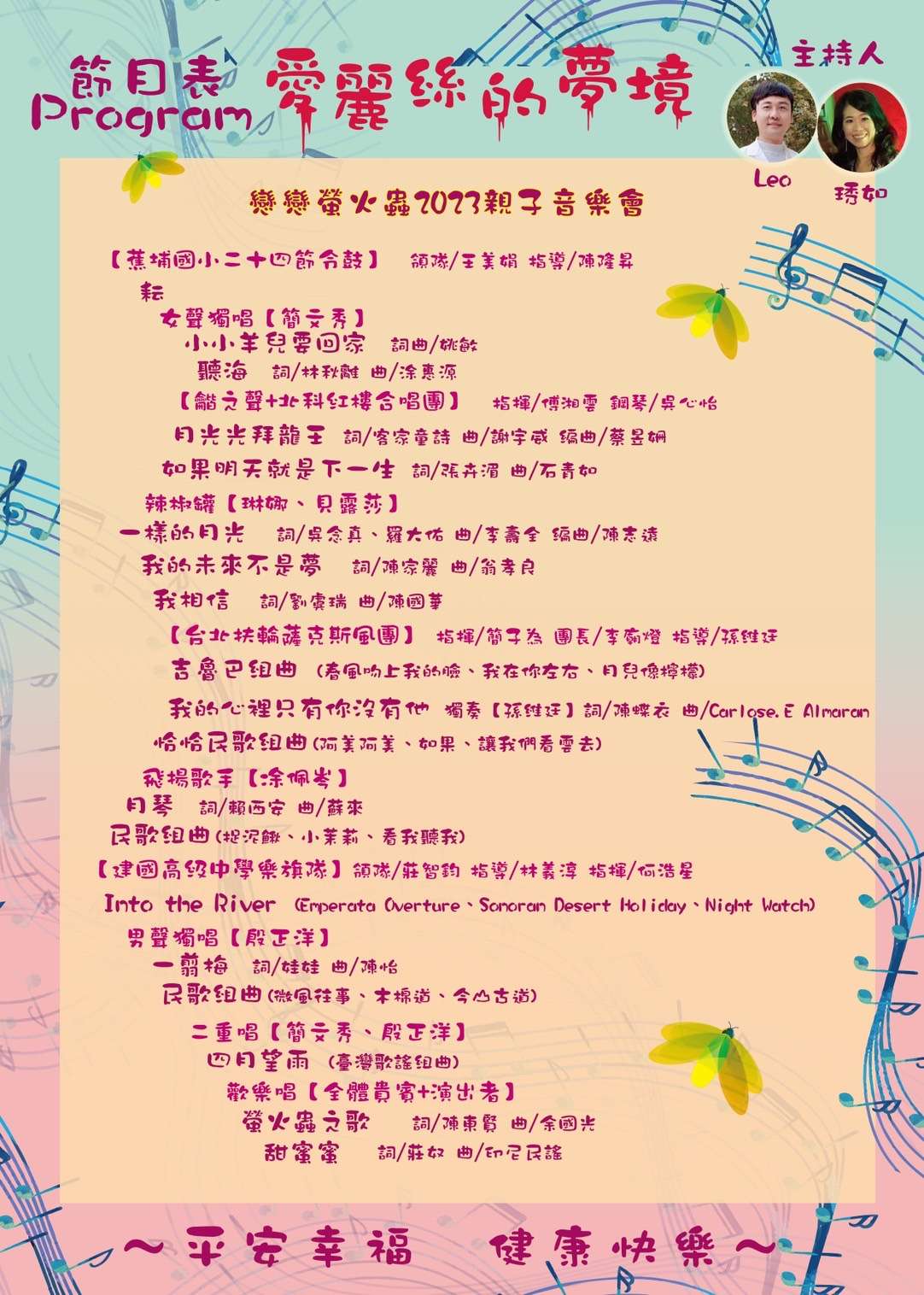 二、本次音樂會將邀請聲樂家簡文秀教授、殷正洋、凃佩岑、 孫維廷、辣椒罐、台北扶輪薩克斯風團、建國高級中學樂旗隊、蕉埔國小二十四節令鼓、龤之聲+北科紅樓合唱團等團體共同演出,是為一場親子同歡的音樂會 。