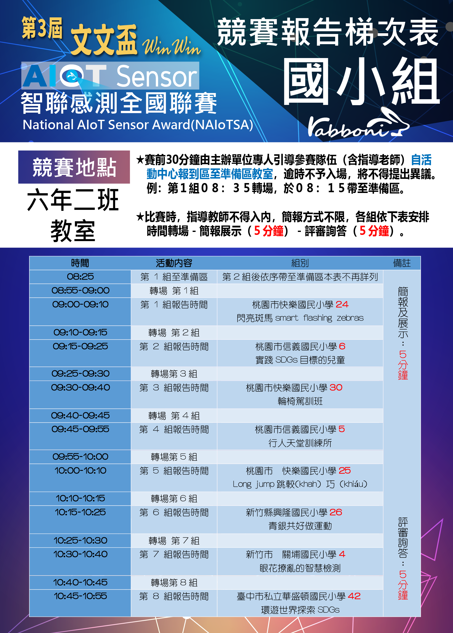 四、檢附「參賽隊伍注意事項」、「全國聯賽各組出場序」、 「全國聯賽流程表」、「獎金分配表」、「空白領據」及 「AIoT Sensor(智聯感測)全國聯賽秩序冊」各1份。