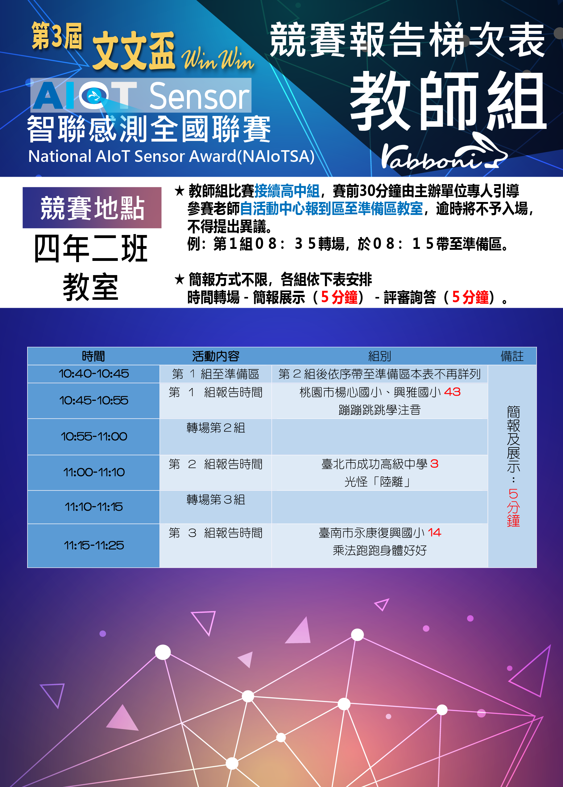 (三)請注意:決賽簡報現場不可露出學校名稱及參賽者個人 資料(包含校服、學號名牌等)。
