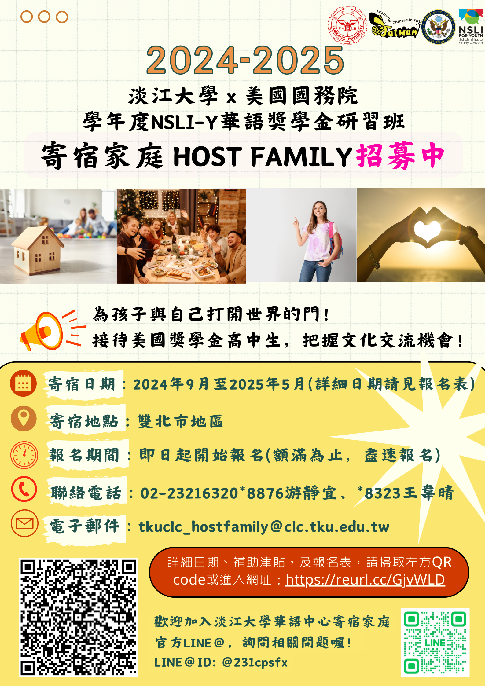 報名網址 (https://reurl.cc/GjvWLD)完成報名,旨揭中心將審核家庭資料並安排實地走訪接待住宿地點,再另行通知錄取及備取名單。