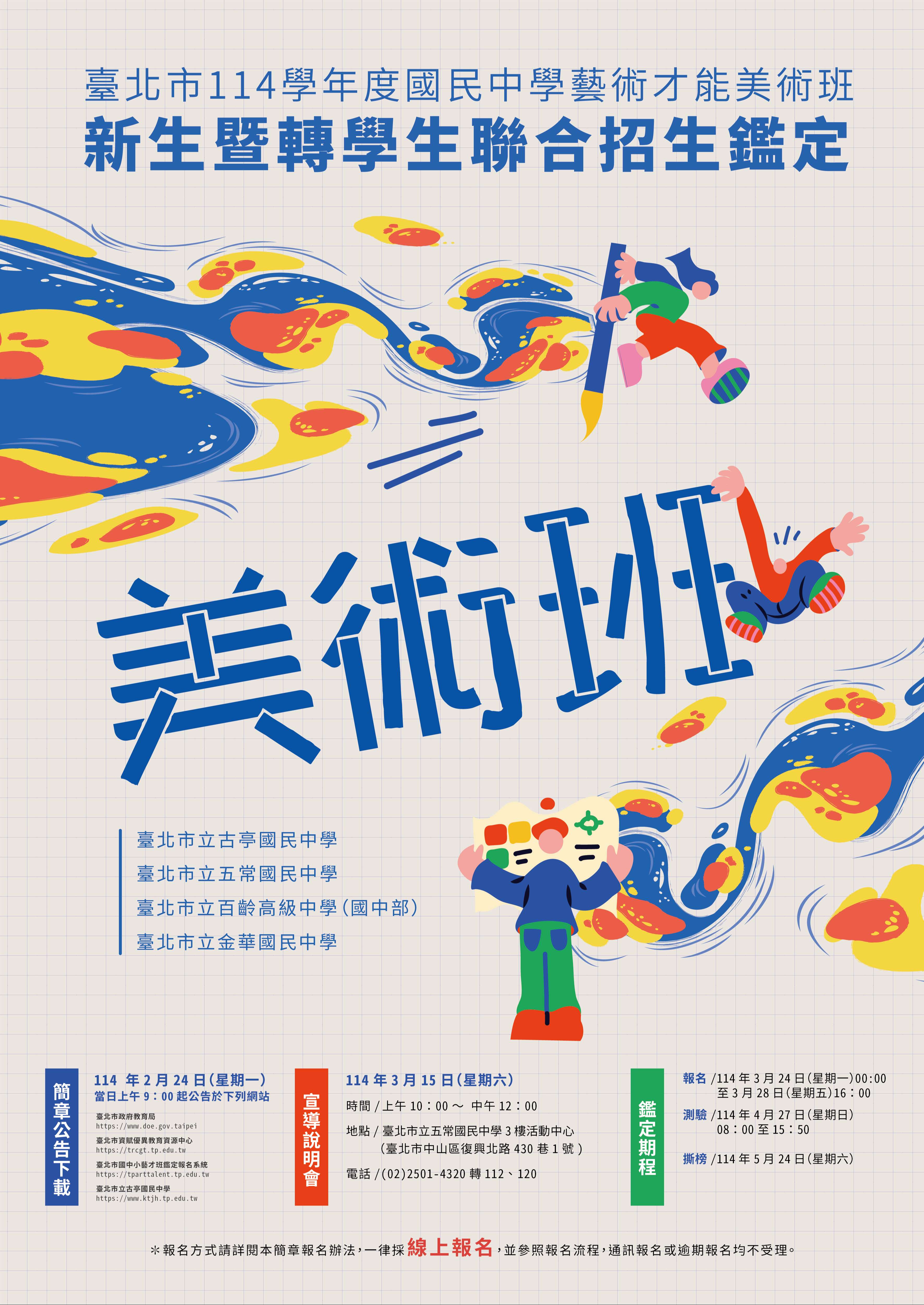 一、114學年度招生鑑定報名自114年3月24日(星期一)0:00至 3月28日(星期五)16:00,3月15日宣導說明會,4月27日 測驗,5月24日撕榜。