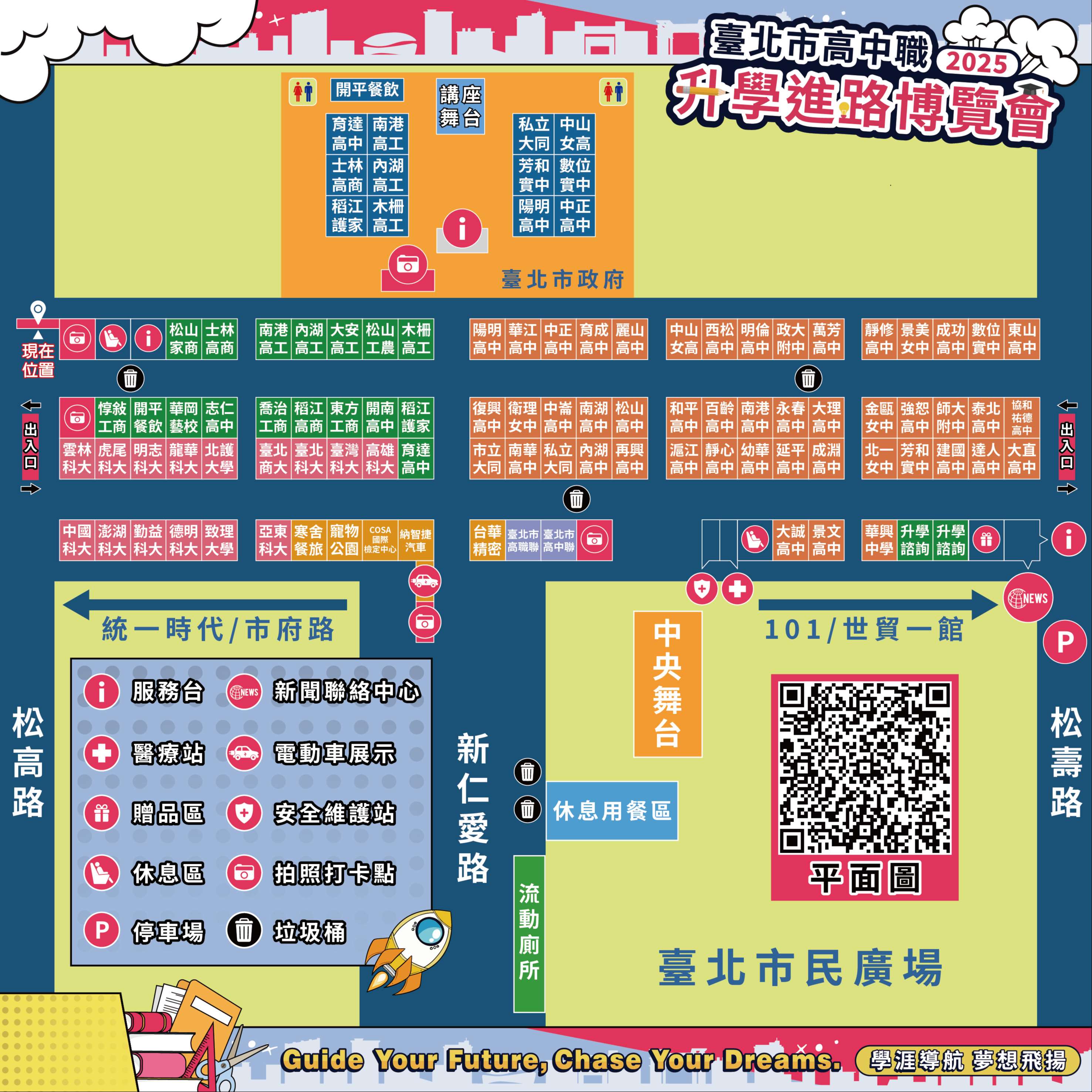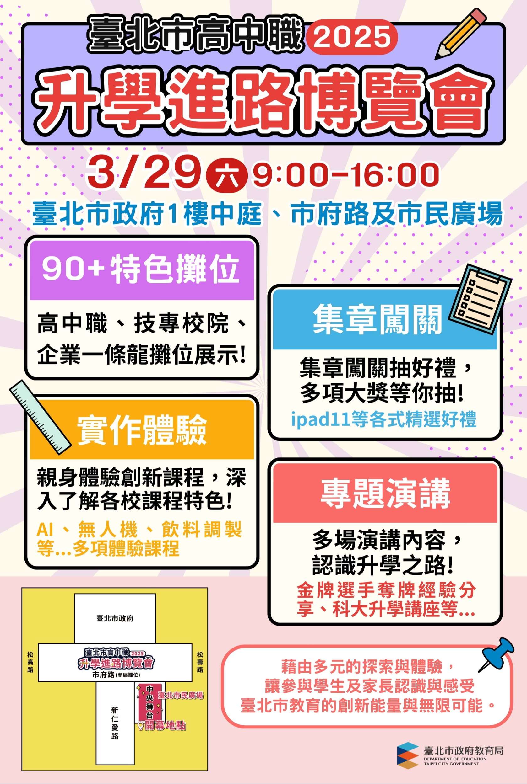 1、特色攤位及互動體驗課程:全國15所大專院校及65所 臺北市高中職學校參與,並設有升學諮詢區、企業攤 位,以及AI、無人機、飲料調製等多項體驗課程。