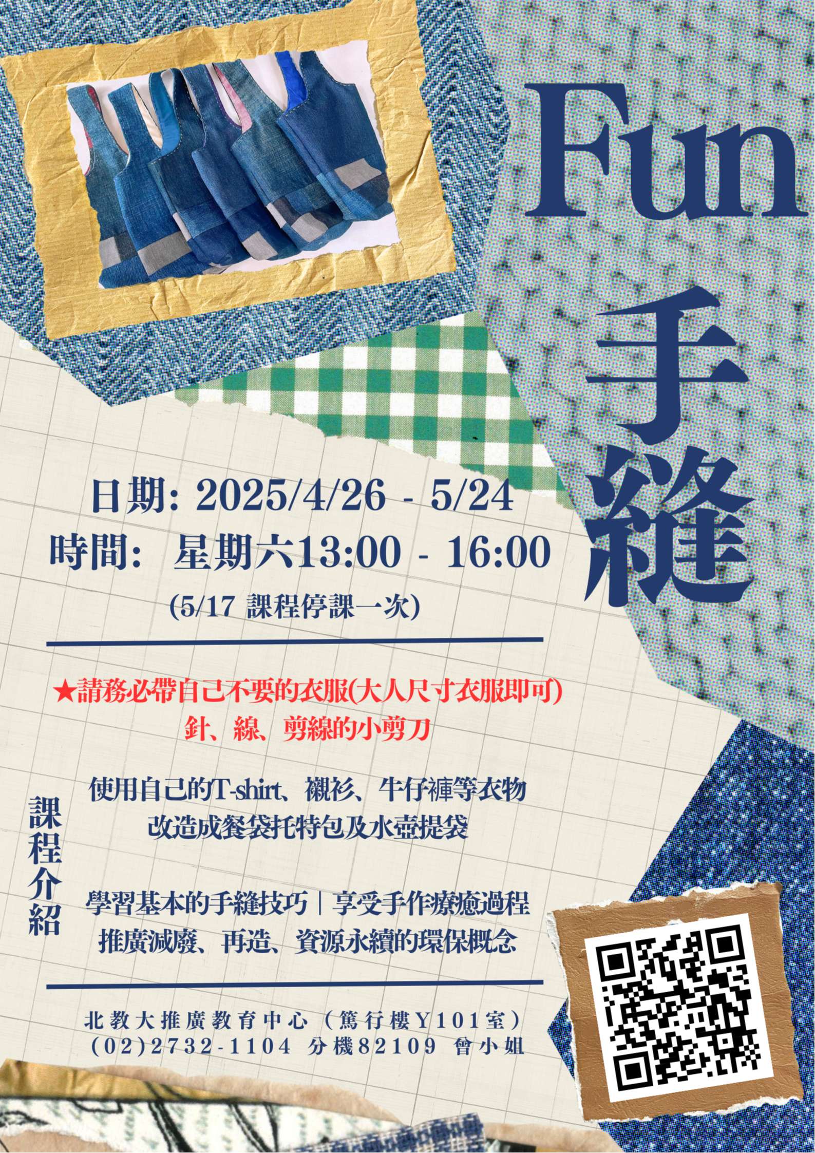 課程相關報名網址如下:Fun手縫(HandMay五月 場) https://cce.ntue.edu.tw/course/5629。