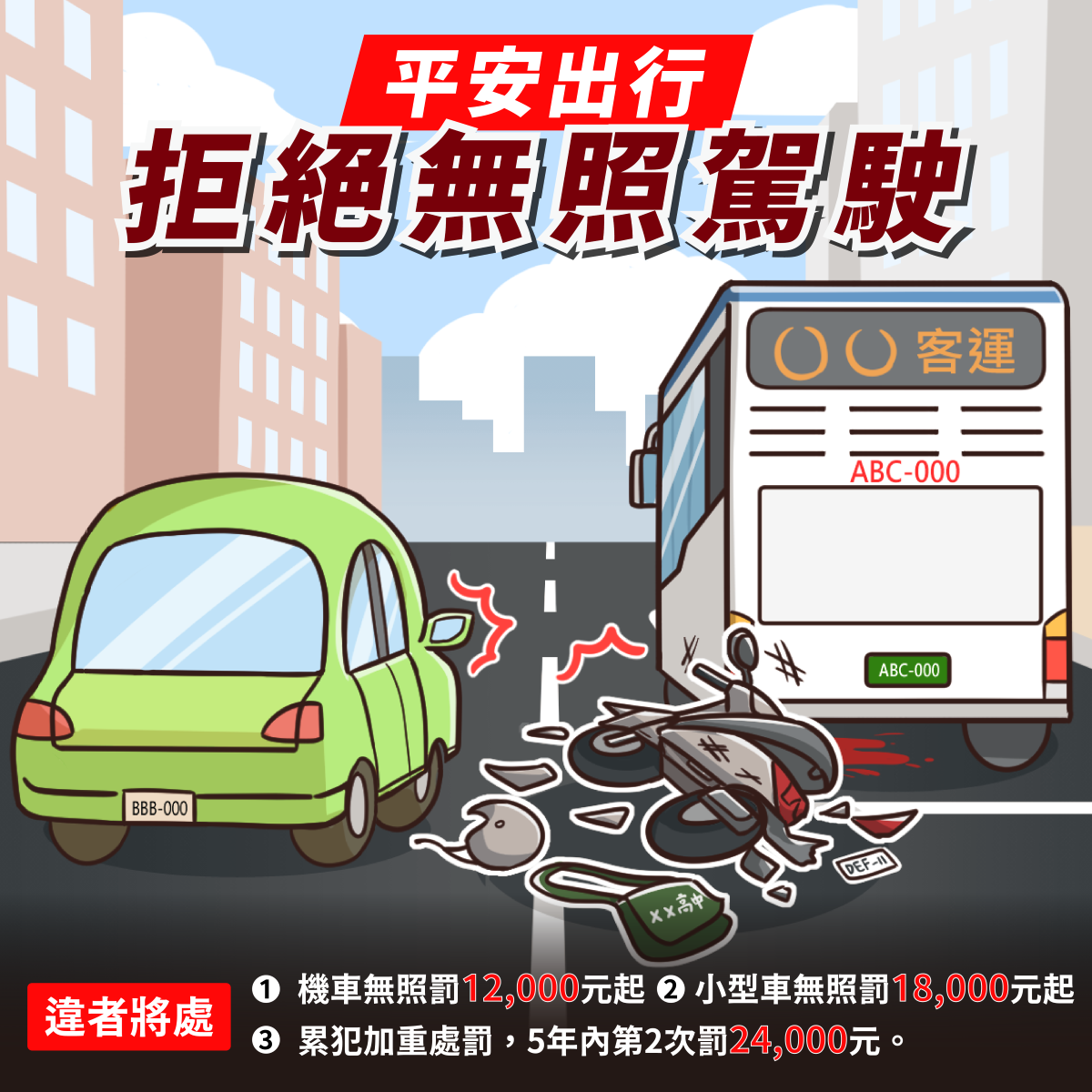無照駕駛機車,罰12,000元起,累犯加重處罰;借機車給無照者,罰12,000元起,吊扣牌照;