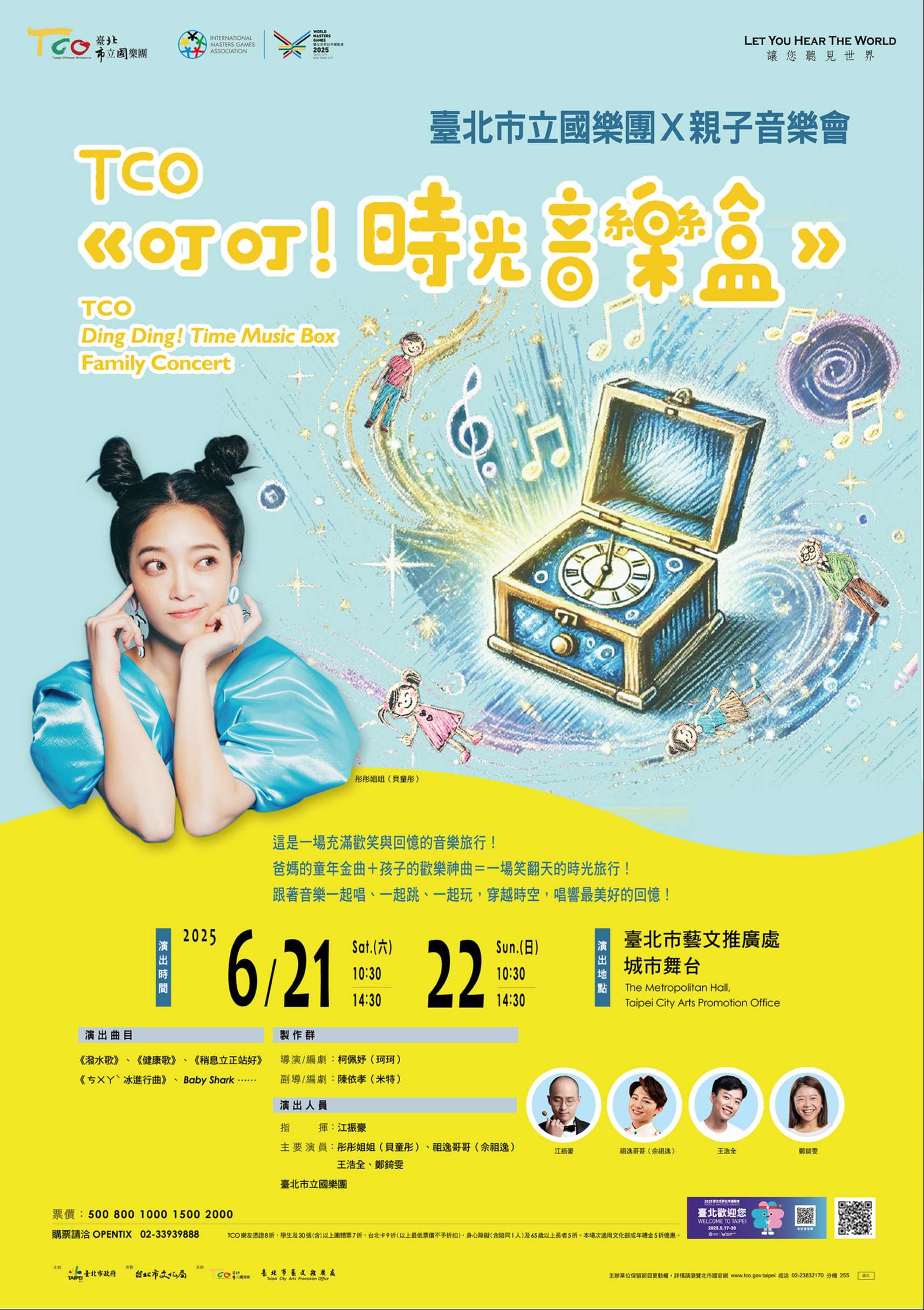 一、臺北市立國樂團(以下簡稱本團)將於114年6月21日、22 日假臺北市藝文推廣處城市舞台演出《叮叮!時光音樂 盒》親子音樂會。