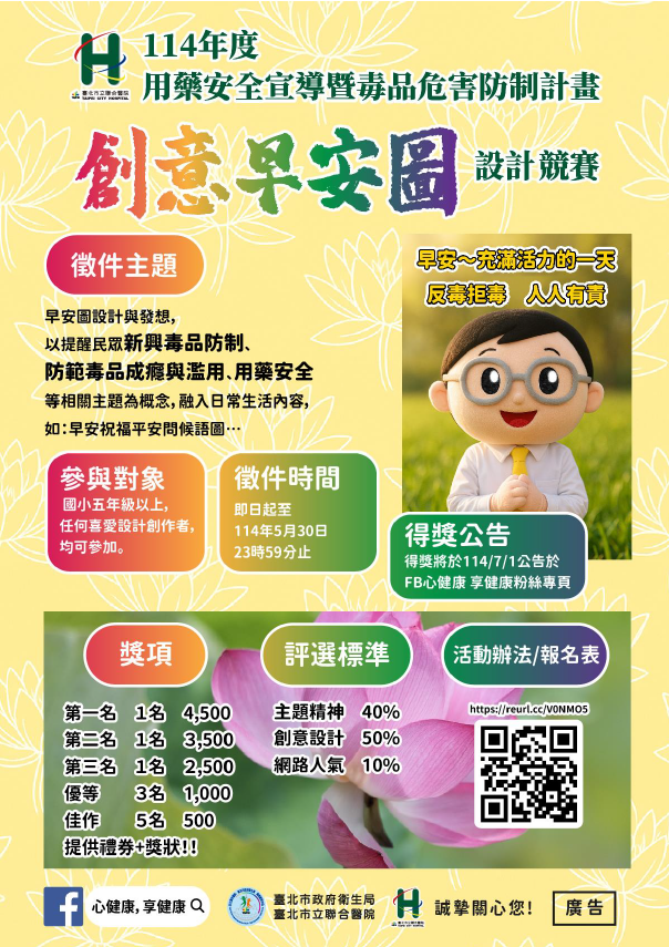 為推廣「用藥安全知識及毒品防制」正確觀念,台北市聯合醫院辦理「創意早安圖」設計競賽,以加強民眾用藥安全 及毒品危害防制藥物濫用之觀念。