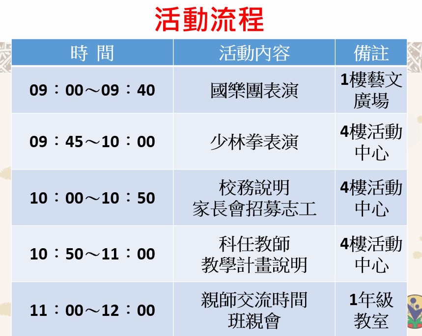 *敬邀*一年級新生家長8/24(日)早上帶寶貝到學校參加學校日喔!*當日活動流程如下,請參閱。