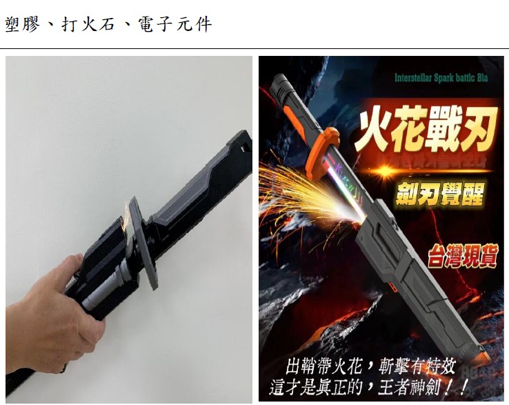 火光刀玩具內含打火石等成分,玩具出鞘瞬間產生之火花 可能會造成眼睛危害。請選購貼有商品檢驗標識之玩具,不宜使用無商品檢驗標識之火光刀等武器玩具,以免發生危害。