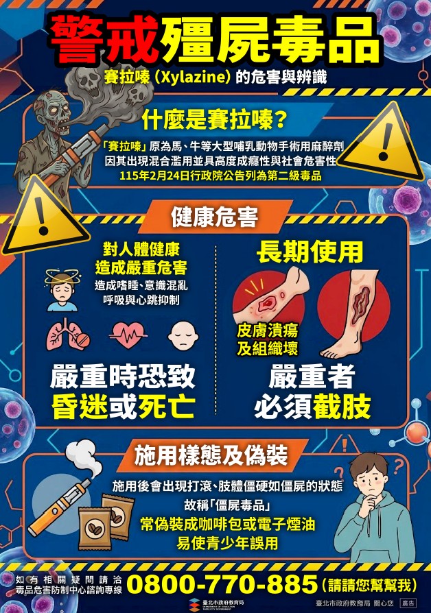 「賽拉嗪(Xylazine)」原為獸醫使用之麻醉藥物,近年遭濫用並常與其他毒品混合使用,施用後會出現打滾、肢體僵硬如僵屍的狀態, 故稱「僵屍毒品」。